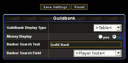 The Banker Search Text and Field tells the Roster how to decide which character is the Banker. So if you have a special guild title, such as Banker, you would enter Banker into the text part and select "Guild Title" as the field. Many guilds just use the Player Note since it doesn't use up the limited Guild rankings.