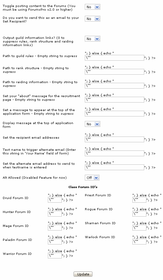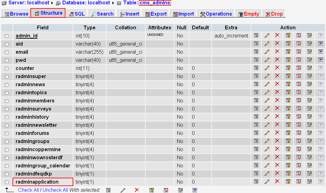 * CMS Warning line 75: On /admin.php?op=modules&install=Application While executing query "CREATE TABLE cms_cms_recruitment ( `status` varchar(32) NOT NULL default '', `druid` varchar(32) NOT NULL default '', `hunter` varchar(32) NOT NULL default '', `mage` varchar(32) NOT NULL default '', `paladin` varchar(32) NOT NULL default '', `priest` varchar(32) NOT NULL default '', `rogue` varchar(32) NOT NULL default '', `shaman` varchar(32) NOT NULL default '', `warlock` varchar(32) NOT NULL default '', `warrior` varchar(32) NOT NULL default '', `grpID` tinyint(10) NOT NULL default '0', `showguildinfo` enum('1','0') NOT NULL default '1', `guildrules` varchar(255) NOT NULL default '', `rankstructure` varchar(255) NOT NULL default '', `raidinginfo` varchar(255) NOT NULL default '', `about` varchar(255) NOT NULL default '', `appmessage` varchar(255) NOT NULL default