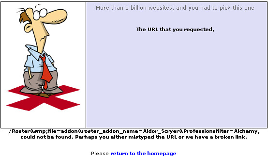 robojerk wrote:Here's my Aldor/Scryer page. When I click on the drop down to choose to view a profession it takes me to an invalid web address.. I am using the dragonfly version of roster.
