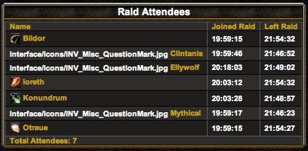 Thanks for the fix... is there a setting in ctraidtracker that records the class and/or class icon? seems like it's randomly using the question mark icon in the raid/attendance view. random meaning for instance, 3 druids in a raid - icon shows for one of the druids but other 2 get question marks (leading me to believe it's and issue with the data recorder(ctrt), not the viewer(your excellent addon