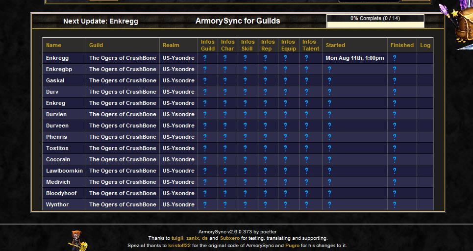 Durvien wrote:.....removing those below lvl 10 and it adds 3 toons that are no longer in the guild. Has anyone figured out if this is a problem with the armory that hopefully Blizzard will get around to or did something change that the mod needs to be updated for?