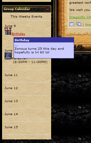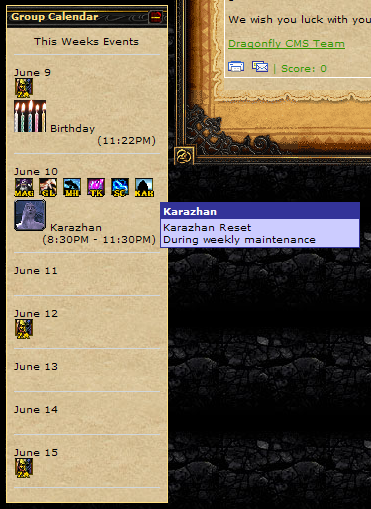 Once WoWRosterDF 2 is released, I would like to see a block for DF that displays calendar events. This block could be configured to show the next seven days of events or more (or less), plus allow users to click on an event to see the event details. I suppose this would be a DF module, or the information shown in the block would be configured in RosterDF.