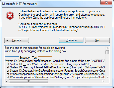 System.IO.DirectoryNotFoundException: Could not find a part of the path '\\ORBIT\Files\Projects\uniuploader\UniUploader\bin\Debug\ORBIT\Files\Projects\uniuploader\UniUploader\bin\Debug'.